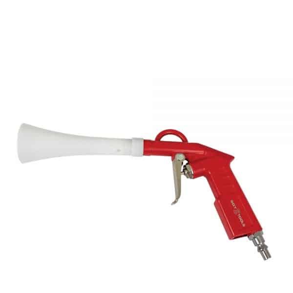 Funciona através de um compressor de ar conectado a ferramenta, para eliminar as sujeiras e umidade de locais de difícil acesso, dentro e fora do veículo.