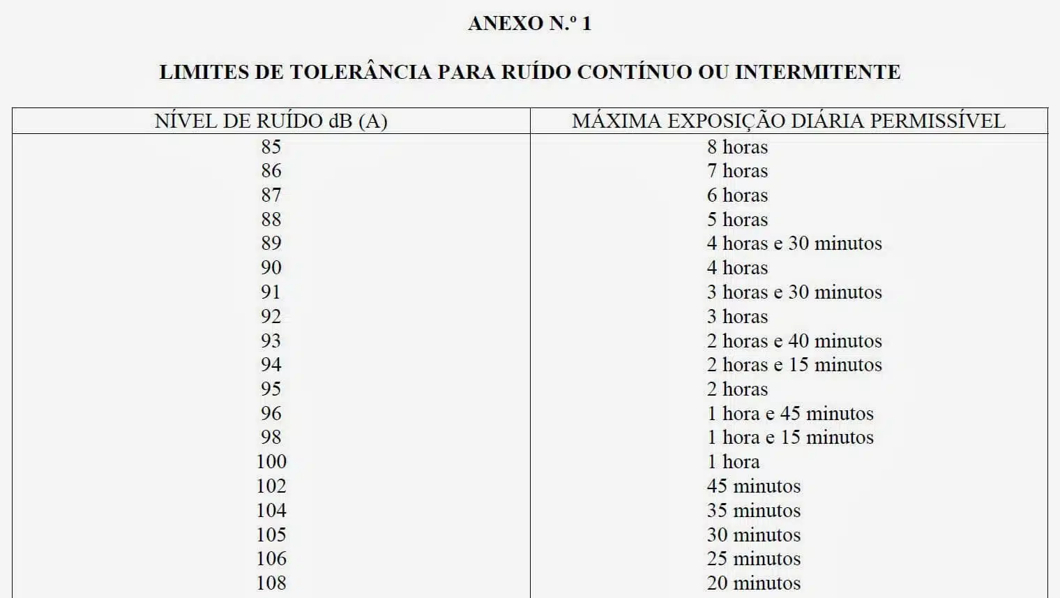 O tempo de exposição segue conforme tabela (Fonte NR-15):